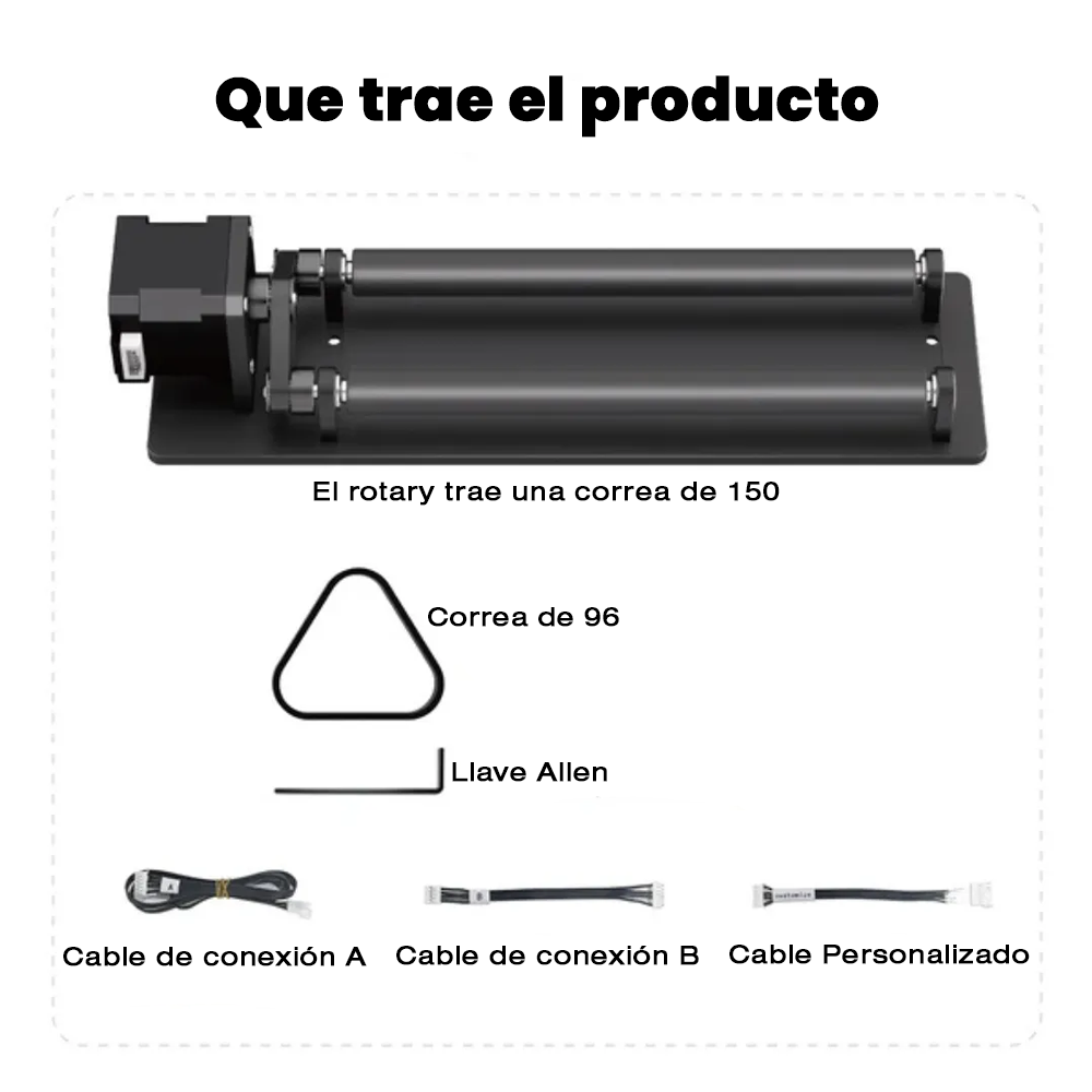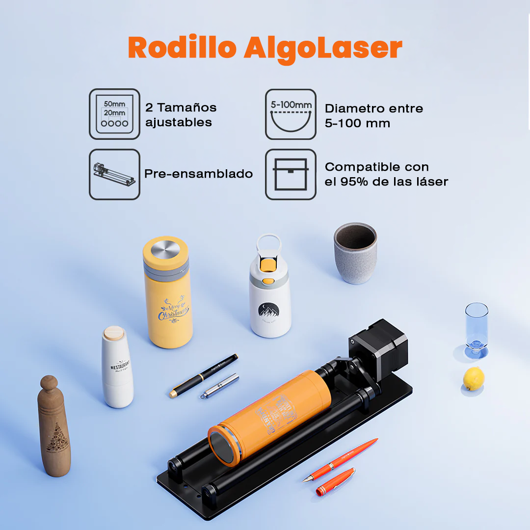 Llevá tus proyectos de grabado al siguiente nivel con el AlgoLaser Rotary Roller ARR1.0, el accesorio ideal para grabar objetos cilíndricos de forma rápida, precisa y profesional. Su diseño robusto y su funcionamiento estable te permiten lograr resultados perfectos en tazas, termos, mates, vasos, botellas, floreros, lapiceras ¡y mucho más!