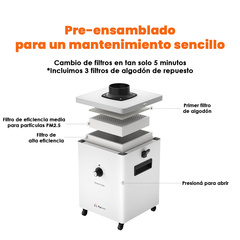 Su estructura a prueba de fugas, sumada a la ventilación unidireccional, evita que el humo se escape, logrando un flujo controlado y completamente hermético. Además, viene pre-ensamblado, permitiendo un mantenimiento ultra sencillo: cambiá los filtros en apenas 5 minutos. Incluye 3 filtros de algodón adicionales.