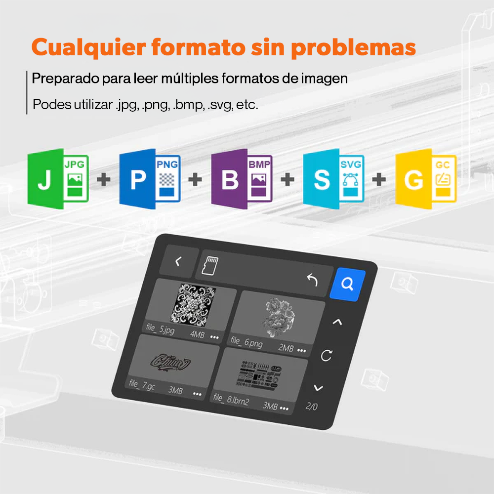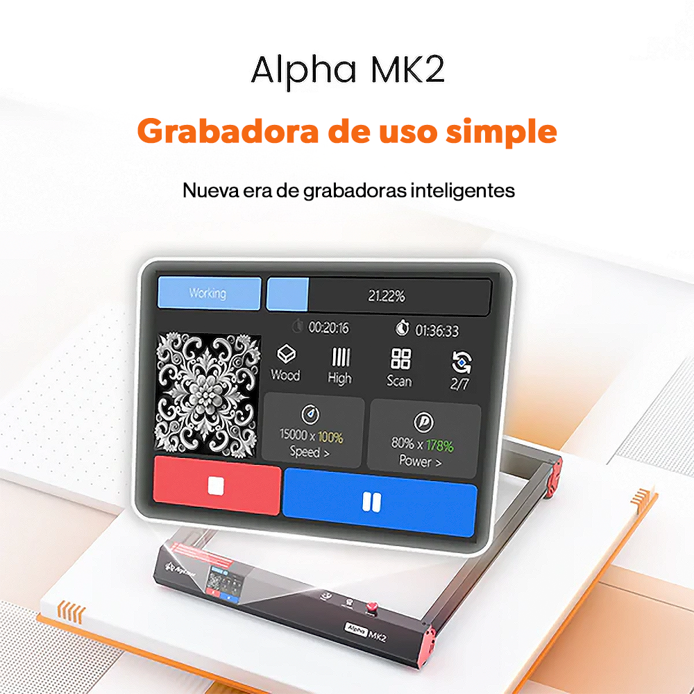 Con su estructura robusta y tecnología avanzada, la Alpha MK2 garantiza resultados consistentes, cortes limpios y grabados impecables en una amplia variedad de materiales: madera, acrílico, cuero, bambú, cartón, metal revestido, acero inoxidable pintado ¡y mucho más!